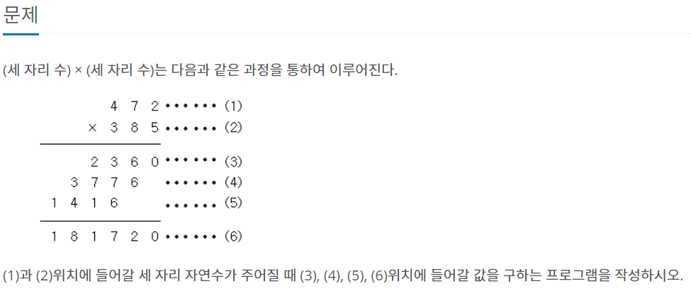 #include <stdio.h> int main() { int A, B; scanf_s("%d",&A); scanf_s("%d", &B); int a, b, c, x, y, z; a = A / 100; b = A / 10 - A / 100 * 10; c = A - A / 10 * 10; x = B / 100; y = B / 10 - B / 100 * 10; z = B - B / 10 * 10; printf("%d\n", z * c + z * b * 10 + z * a * 100); printf("%d\n", y * c + y * b * 10 + y * a * 100); printf("%d\n", x * c + x * b * 10 + x * a * 100); printf("%d", A * B); }# 결과