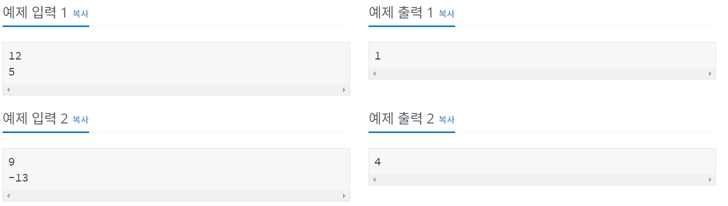 #include <stdio.h> int main() { int x, y; scanf_s("%d", &x); scanf_s("%d", &y); if (x > 0 && y > 0) printf("1"); else if (x < 0 && y > 0) printf("2"); else if (x < 0 && y < 0) printf("3"); else if (x > 0 && y < 0) printf("4"); }# 결과