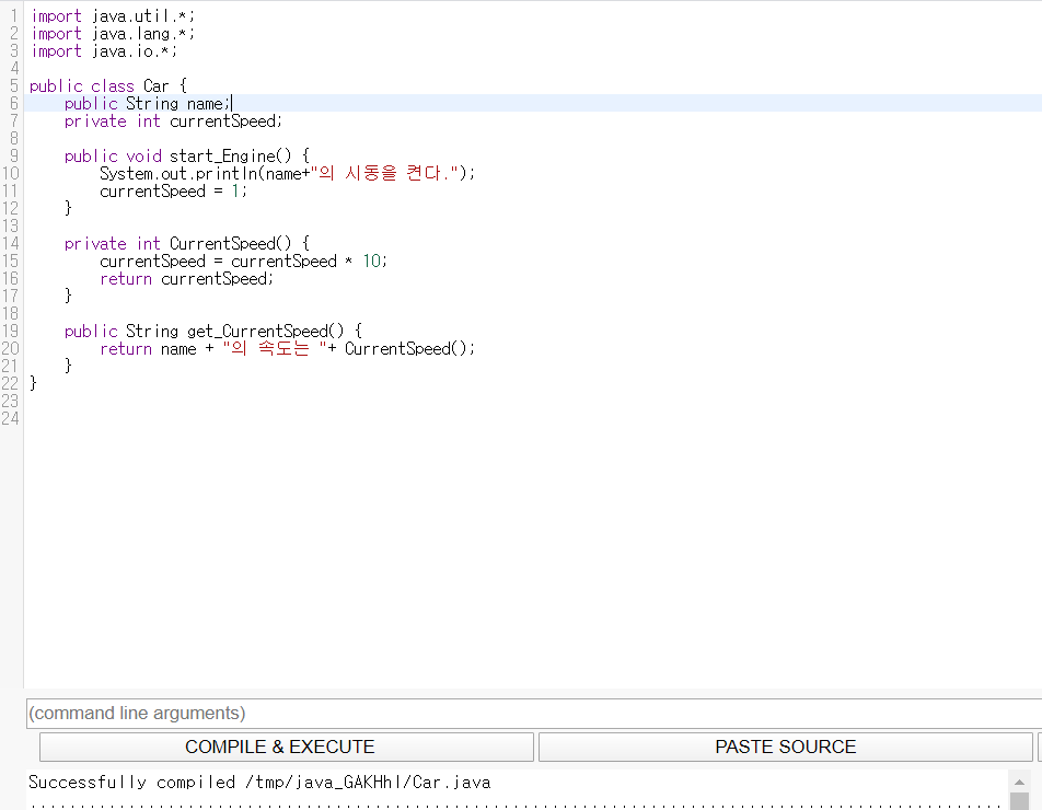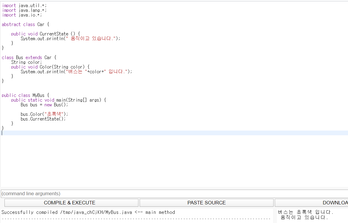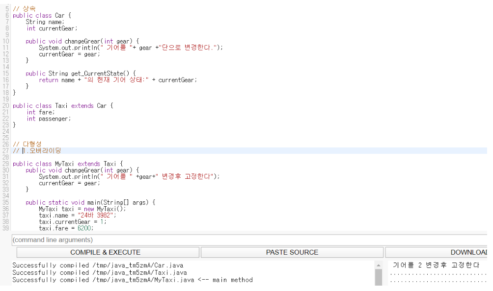 // 상속 extends public class Car { String name; int currentGear; public void changeGrear(int gear) { System.out.println(" 기어를 "+ gear +"단으로 변경한다."); currentGear = gear; } public String get_CurrentState() { return name + "의 현재 기어 상태:" + currentGear; } } public class Taxi extends Car { int fare; int passenger; }// 다형성 // 1.오버라이딩 >> 출력 : 기어를 2 변경후 고정한다. public class MyTaxi extends Taxi { public void changeGrear(int gear) { System.out.println(" 기어를 " +gear+" 변경후 고정한다"); currentGear = gear; } public static void main(String[] args) { MyTaxi taxi = new MyTaxi(); taxi.name = "24바 3982"; taxi.currentGear = 1; taxi.fare = 6200; taxi.passenger = 2; taxi.changeGrear(2); taxi.get_CurrentState(); } }// 추상화 (abstract) abstract class Car { public void CurrentState () { System.out.println(" 움직이고 있습니다."); } } class Bus extends Car { String color; public void Color(String color) { System.out.println("버스는 "+color+" 입니다."); } } public class MyBus { public static void main(String[] args) { Bus bus = new Bus(); bus.Color("초록색"); bus.CurrentState(); } }// 캡슐화 (은닉 private) public class Car { public String name; private int currentSpeed; public void start_Engine() { System.out.println(name+"의 시동을 켠다."); currentSpeed = 1; } private int CurrentSpeed() { currentSpeed = currentSpeed * 10; return currentSpeed; } public String get_CurrentSpeed() { return name + "의 속도는 "+ CurrentSpeed(); } }# 구현모습